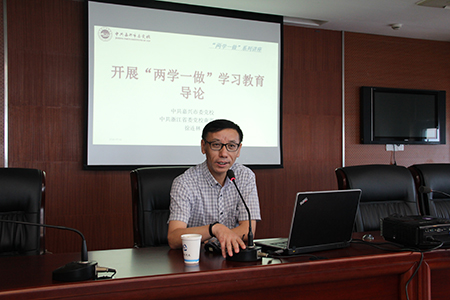 徐連林副校長從把握好現實意義、領會好基本精神、掌握好實踐要求三個方面入手,圍繞該怎樣領會中央精神、把握基本精神、四講四有等問題展開論述。學習黨章黨規是首要任務,黨章是黨的旗幟、黨的“憲法”,學習黨章黨規能喚醒黨員意識,強化黨員自律,增強黨的純潔性建設;學習系列講話,可以堅定理想信念,強化自覺性,加強黨的先進性建設。同時,學習系列講話精神應把握三個重點:習近平總書記執政理念和風格、治國理政新理念新思想新戰略、所蘊含的立場觀點方法。做合格黨員,要做到“四講四有”,即“講政治、有信念,講規矩、有紀律,講道德、有品行,講奉獻、有作為”。最后,徐連林副校長用一句“共產黨人需要一份精神上的堅守”與大家共勉!