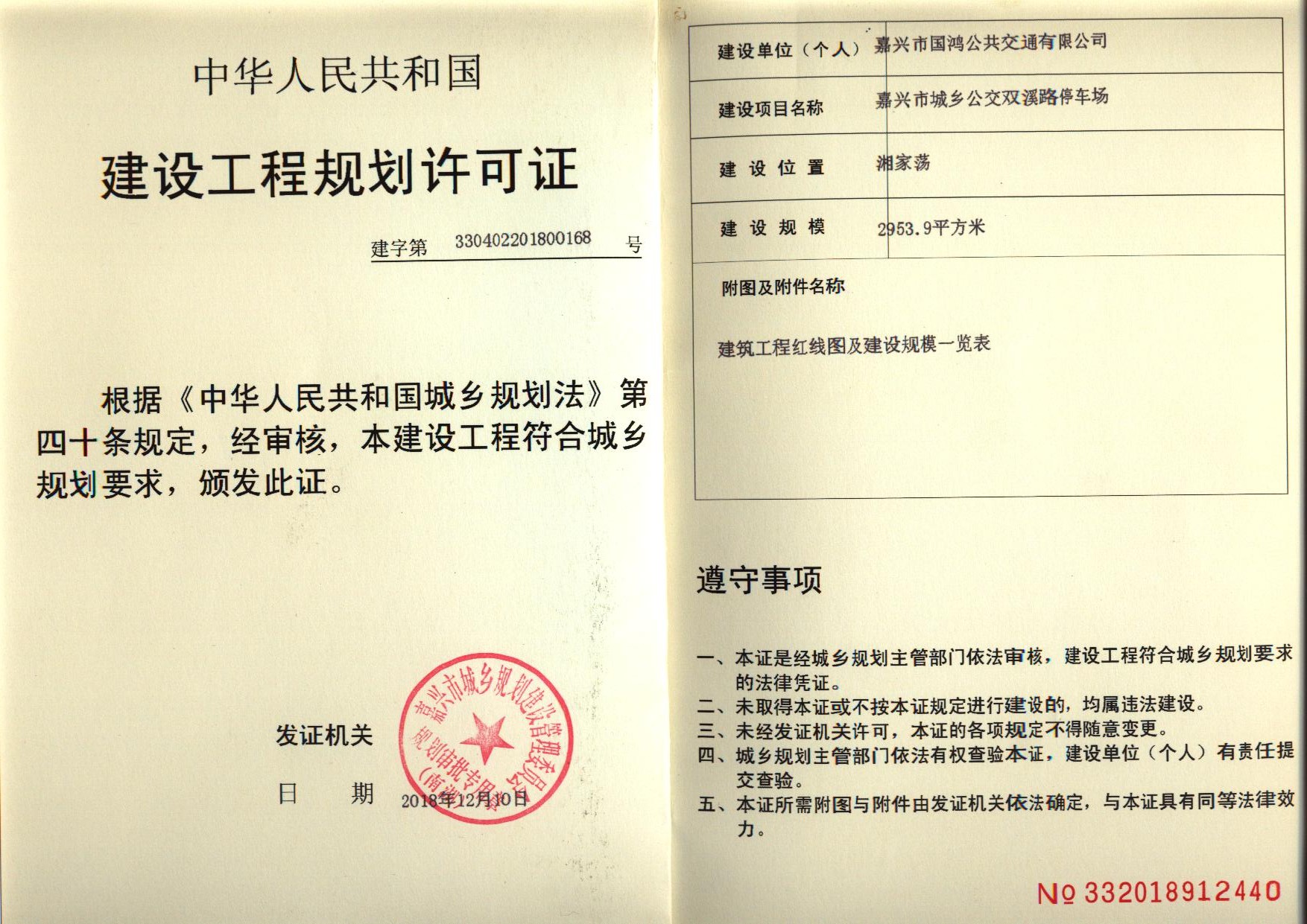 嘉興市城鄉公交雙溪路停車場建設工程規劃許可證